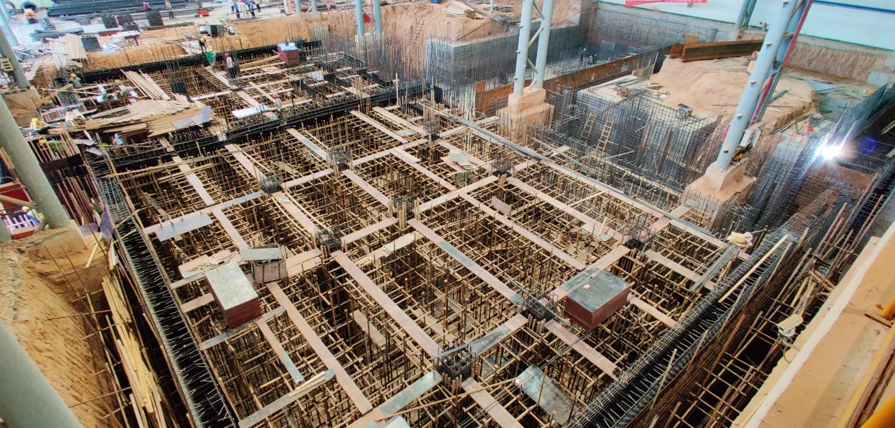 5月29日一大早,筆者來到豫聯集團下屬企業中孚高精鋁材公司第三臺冷軋機項目建設現場,看到近百名施工人員正在緊張有序地忙碌著,有的進行混凝土結構鋼筋綁扎焊接,有的進行混凝土澆筑模板安裝加固,有的進行預埋鋼襯板焊接校正,電焊機、鋼筋彎曲機、模板切割機等設備運行的聲音此起彼伏,到處是一派爭分奪秒、加快建設的繁忙景象。