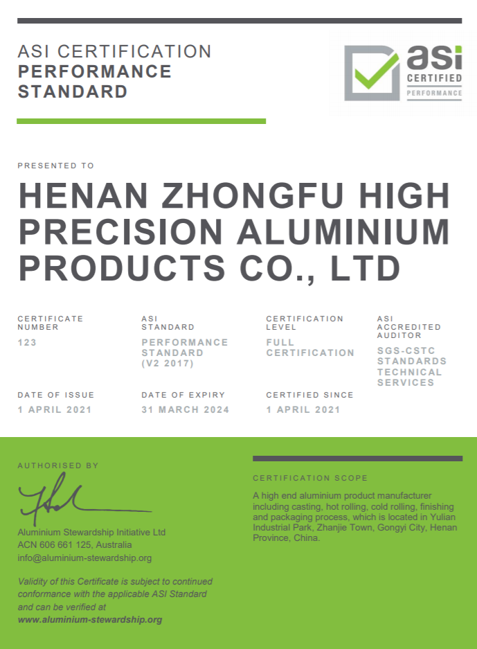 4月21日,中孚高精鋁材公司成功通過鋁業(yè)管理倡議(ASI)績效標準認證,踐行了企業(yè)對鋁的負責任生產、采購和管理等方面的承諾。
