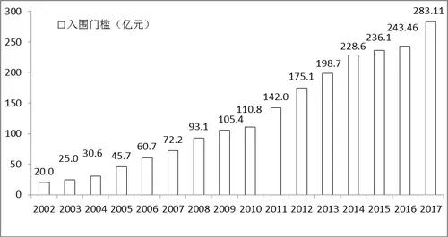 ▲中國企業500強的入圍門檻及增幅(2002-2017)