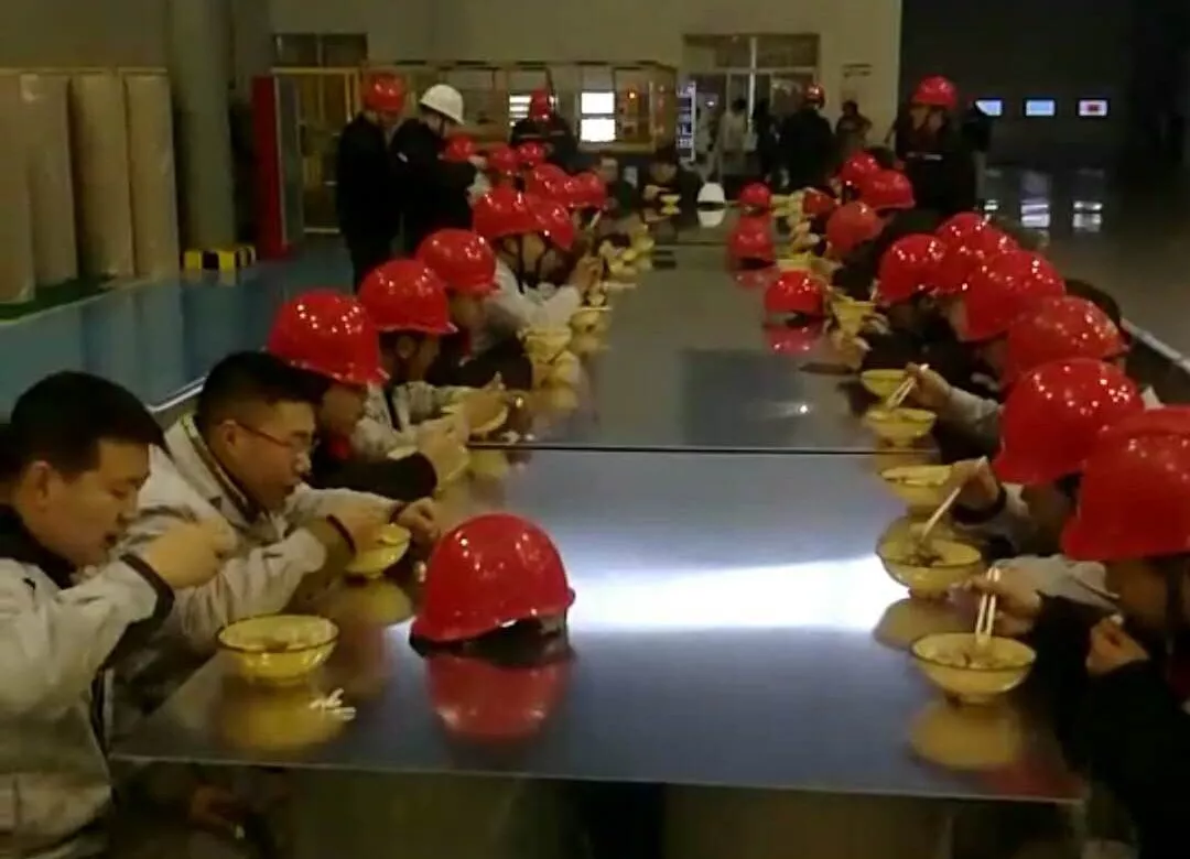 除夕晚上,忙碌了一天的員工們,與高精鋁領(lǐng)導(dǎo)、分廠經(jīng)理圍坐在一起,吃著熱騰騰的餃子。