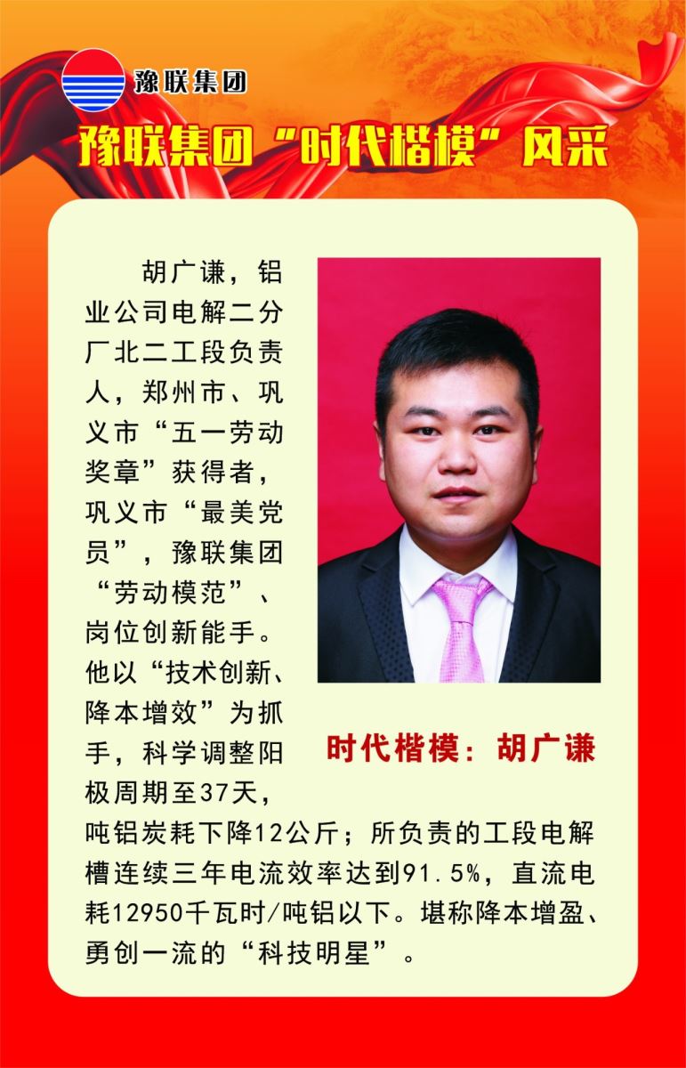他,是鄭州市、鞏義市“五一勞動獎章”獲得者,他,是鞏義市最美黨員,豫聯集團“時代楷模”、青年崗位能手......他,開發了“3N”鋁特區、研發了攻克低鐵槽的技術......他,叫胡廣謙,中孚鋁業公司電解二分廠北二工段負責人,2006年進入公司工作,扎根電解生產一線,勤學苦練,潛心鉆研,降本增效,勇創一流。