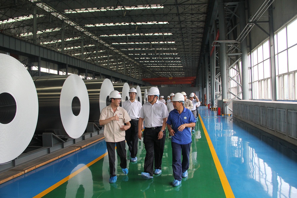 在集團公司張洪恩董事長及有關(guān)領(lǐng)導(dǎo)的陪同下,中國銀行河南省分行領(lǐng)導(dǎo)金瑜銘一行頂著炎炎烈日,深入生產(chǎn)一線,先后參觀了電力公司、鋁業(yè)公司400KA鋁電解生產(chǎn)線。隨后,銀行領(lǐng)導(dǎo)重點參觀了高性能鋁合金特種鋁材項目生產(chǎn)及建設(shè)現(xiàn)場。中孚高精鋁公司負責人向銀行領(lǐng)導(dǎo)簡要介紹了生產(chǎn)工藝流程、產(chǎn)品質(zhì)量及市場開拓情況。金瑜銘一行興致勃勃地參觀了镕鑄、熱軋、冷軋的完整工序,或駐足觀看,或即興提問,或相互交流。當看到銀光閃閃的合金板錠時,他們?nèi)滩蛔≥p輕撫摸,對企業(yè)整體轉(zhuǎn)型成果表示由衷的贊嘆。