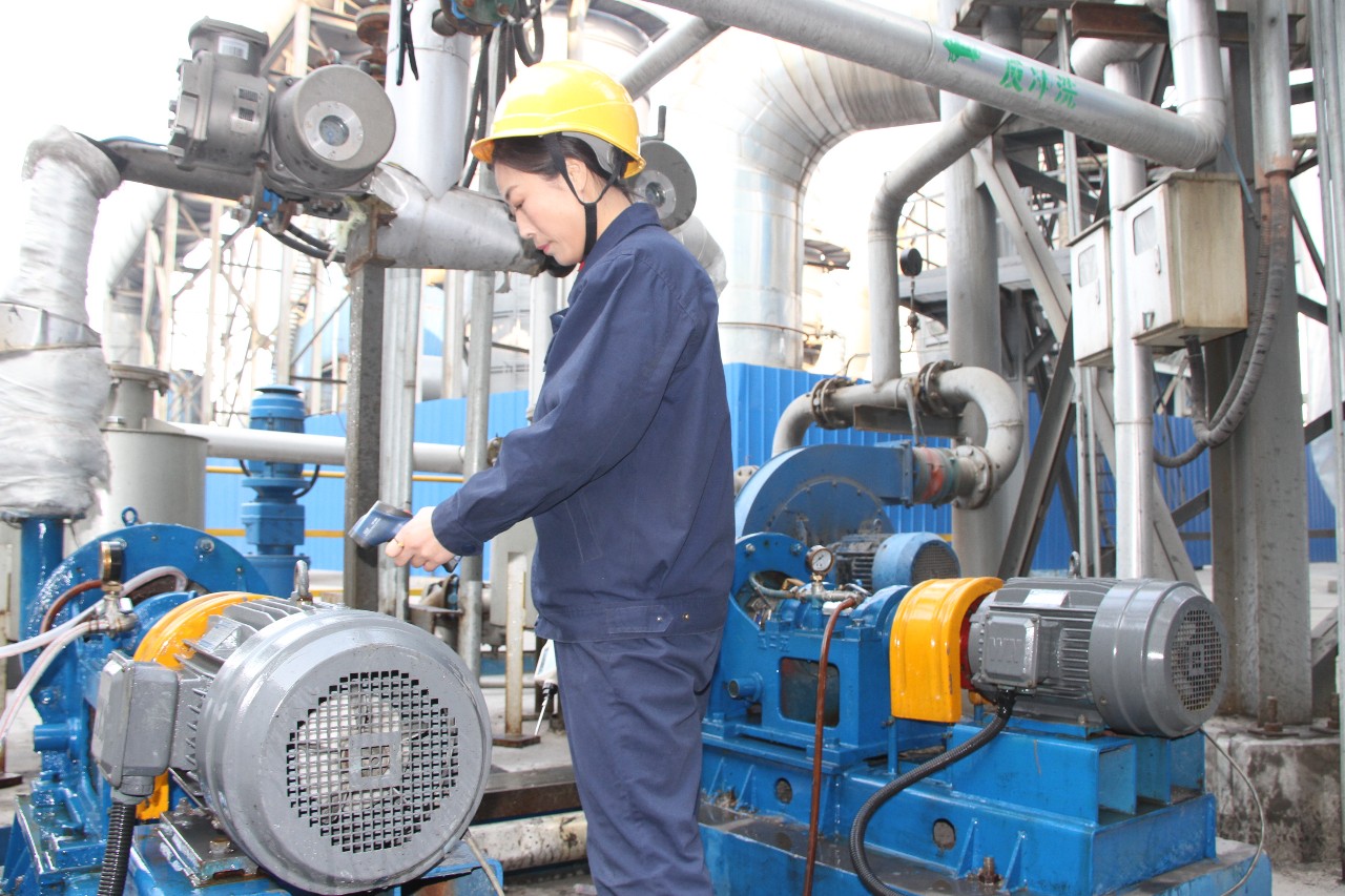 中孚炭素公司:焙燒脫硫脫硝現場,崗位人員使用測振儀認真檢查脫硫系統地坑池泵運行情況